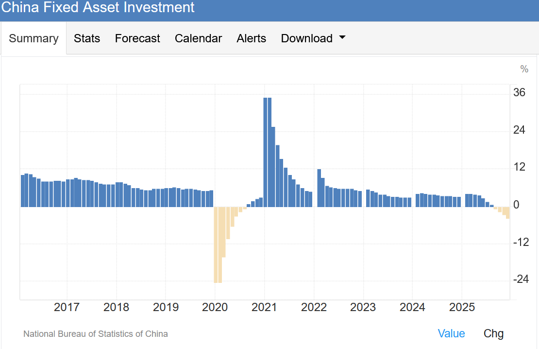 Excluding the Corona lockdowns of 2020, 2025 actually saw the first annual decline in the investments since 1989, when China experienced an economic crisis caused by runaway inflation and collapse in industrial profits (and hence production). While the collapse is now mainly driven by a drastic fall in property investments, investments in other sectors have failed to cover for it. At this point, it would be important for the services sector to start to grow rapidly through household consumption to carry the Chinese economy. However, like Tuomas noted in Exit the Dragon, Chinese consumer is maxed out. These imply both declining economy momentum from China as well as increased stimulus by Beijing to counter it. This is also what our forecasting model is anticipating.